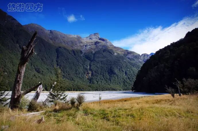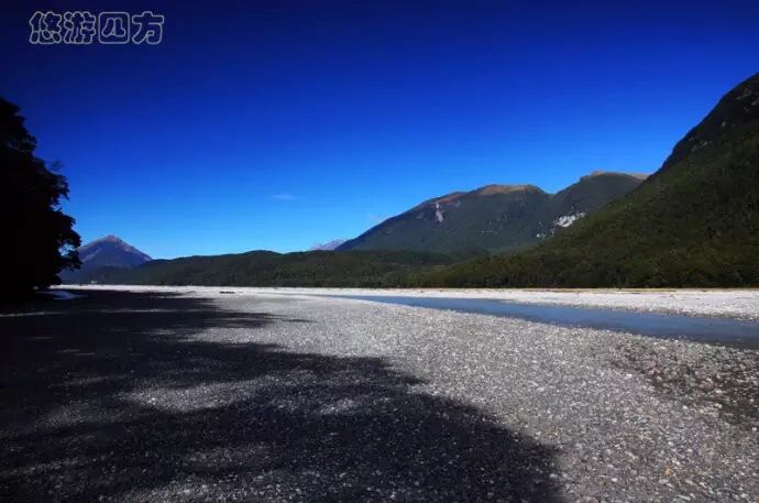 这里是开阔的达特河滩。杳无人迹,只有蓝天、群山、森林和流水,一切都是原生态,仿佛时空穿越,来到了《魔戒》等电影的场景里,置身中古世纪般的场景。