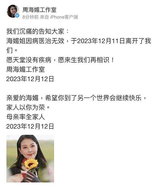 近日驚傳香港藝人周海媚離世,但一直未獲證實。直至今日( 12/12),周海媚工作室於晚上發出公告,證實周海媚因病醫治無效,於2023年12月11日離世,享年57歲。